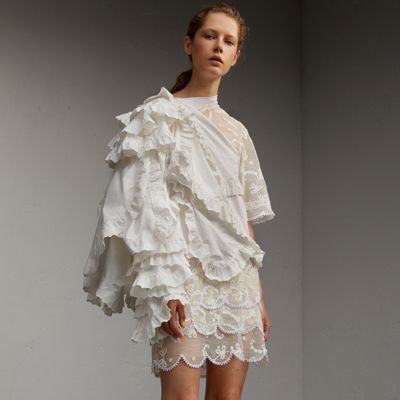 base is made from fine cotton voile with tiered panels of scallop-edged