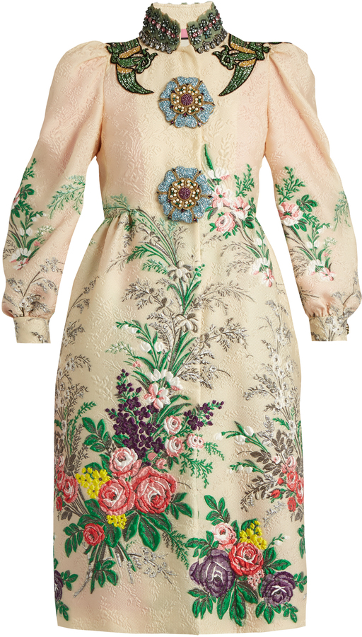 represented by this richly embellished nude-pink and cream floral-cloqué