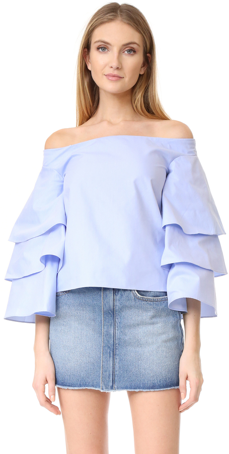 DetailsAn off-shoulder endless rose top with tiered ruffles at the half sleeves. Gathered elastic neckline.