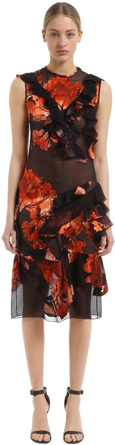 neckline. Sleeveless. Side zip closure . Asymmetrical tiered ruffles .