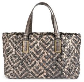 tote rendered in exotic mix of karung and lizard. Double top handles.