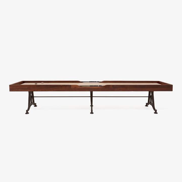The Edge Shuffleboard Table is handcrafted from North American white oak. Its frame is made from reclaimed, hand laminated wood sourced from French colonial era bridges, factories and warehouses in Vietnam. Features hand stitched umber leather and cast iron legs by local craftsmen using traditional techniques. Black iron develops a natural, red-orange patina over time. Edge Foosball Game Table also available.Re-wax all parts at least once a year to prevent an accelerated patina process. Reclaimed hardwood can be wiped with any wax-based polish.