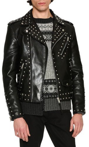 McQueen classic motorcycle jacket in calf leather with stud trim. Notch