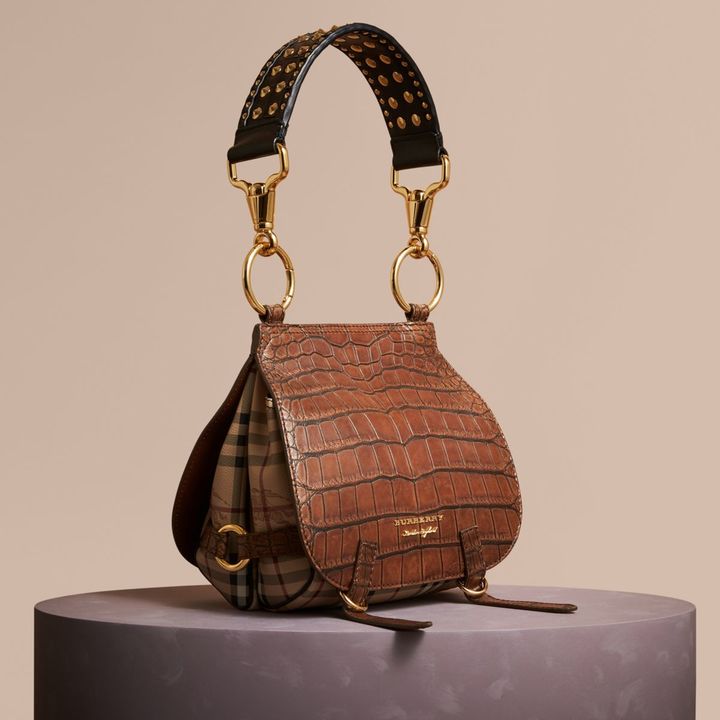 equestrian-inspired runway satchel in alligator and Haymarket check.