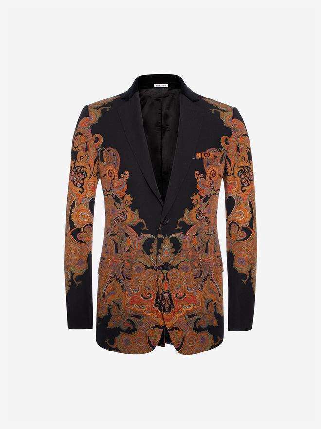 black satin jacket with an engineered multicolor paisley print. The