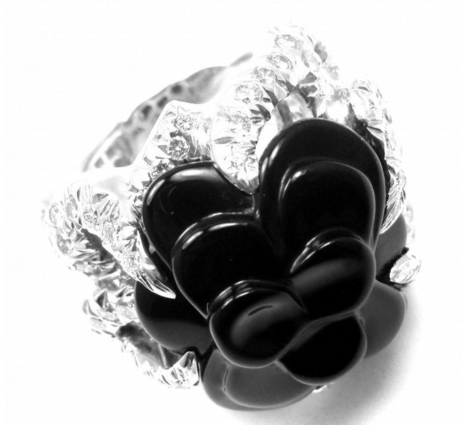 Chanel Camelia Camellia Flower 18K White Gold with Diamond & Onyx Ring Size 6.25 Features: