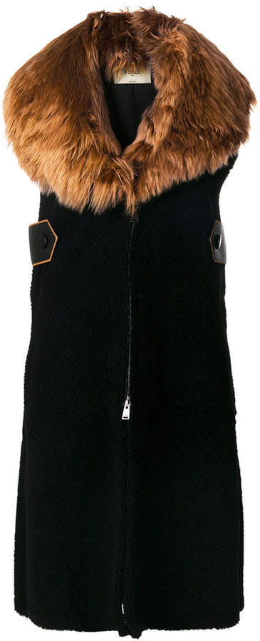 wide lapel, a front zip fastening and a sleeveless design.