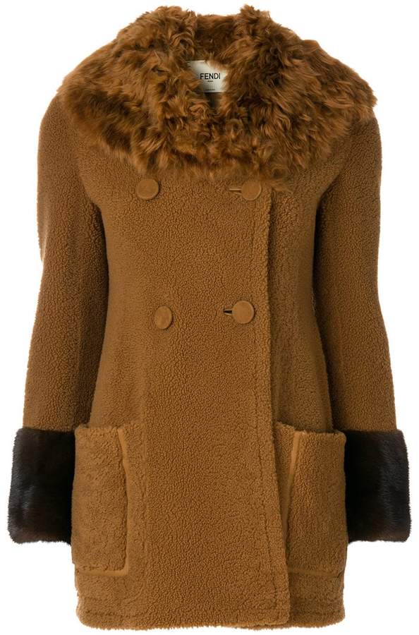 features a fur trim, a double breasted front fastening, long sleeves,