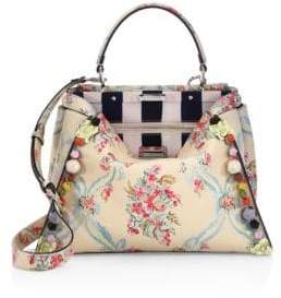 printed leather satchel framed with floral appliques. Top handle, 4"
