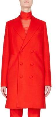 Double breasted button-front. About 34" from shoulder to hem. Wool. Dry