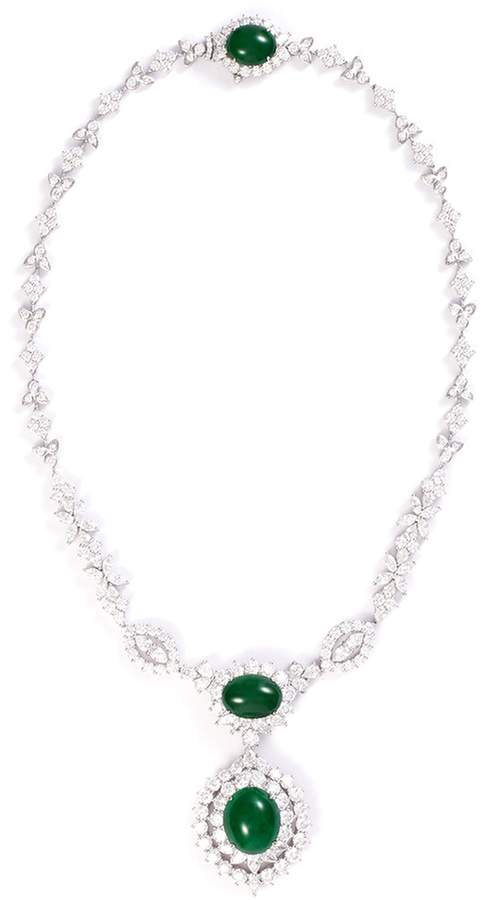 LC collection gives oriental elegance a modern interpretation with this necklace. Mounted with two jade cabochons, this statement piece is artfully flourished with assorted cut diamonds along the décolletage.