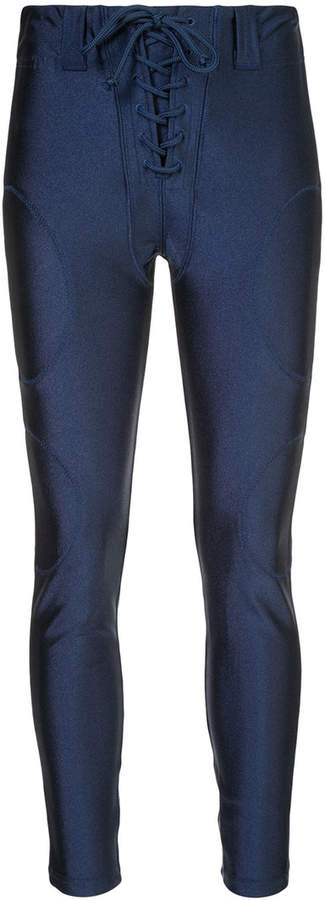 feature a slim fit, a lace fastening, a waistband with belt loops and