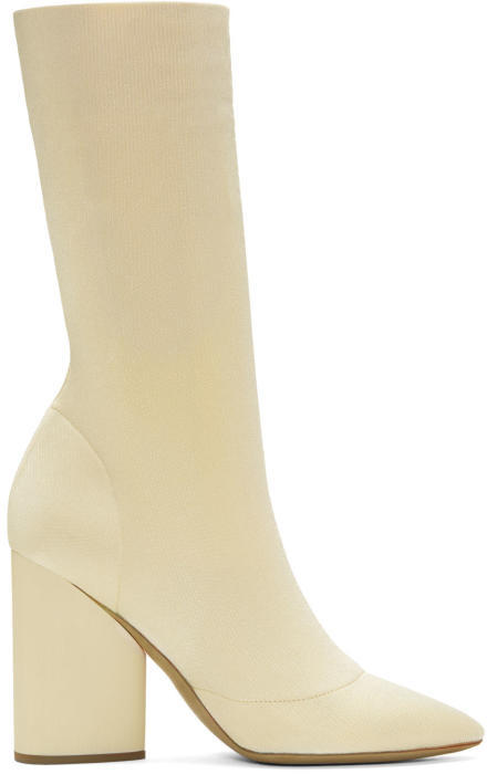 stretch knit boots in cream ivory. Pointed toe. Tonal block heel.