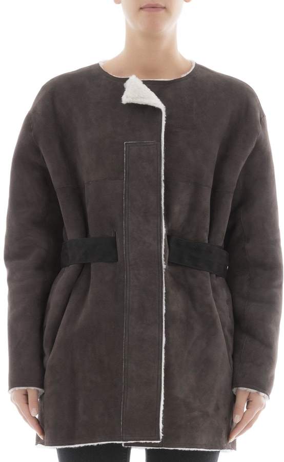 Dark brown lamb leather coat. Snap closure. Adjustable belt. Long sleeves. Two open pockets on the front. Lamb fur lining detail.