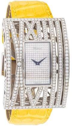 18K white gold 52mm x 37mm Chopard Montre Dame XL watch featuring a quartz movement with diamonds throughout openwork bezel, pavé diamond dial, crocodile strap and diamonds at tang buckle closure. Includes box and additional lizard and alligator straps. Unfortunately, due to restrictions, this item cannot be shipped internationally.