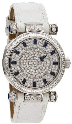 18K white gold 30mm Franck Muller Mystery watch featuring an automatic movement with open exhibition case back and visible platinum rotor, diamond bezel and lugs, pavé diamond dial with near colorless and very slightly included diamonds, white alligator strap and diamond embellished tang buckle closure. Unfortunately, due to restrictions, this item cannot be shipped internationally.
