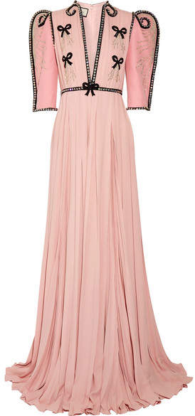 plissé-chiffon skirt. Swarovski crystals and bows add to its whimsical