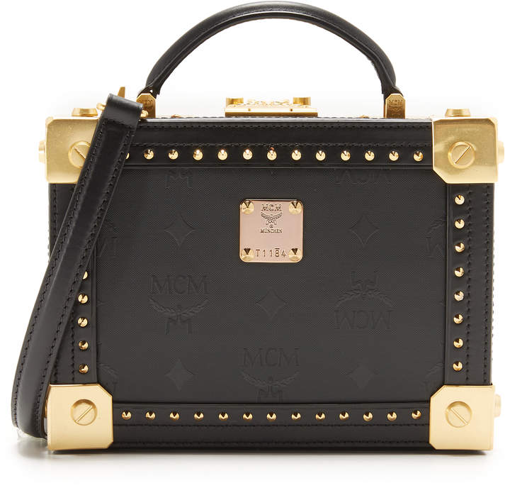 scaled-down MCM cross-body bag imitates a vintage trunk. Gold-tone