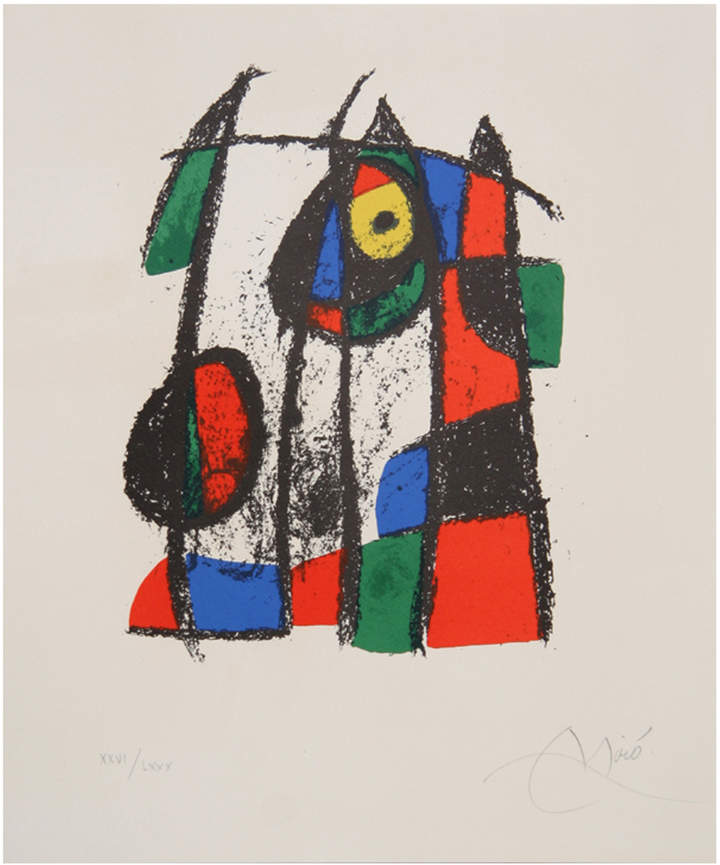 Lithograph II (M. 1043) Lithograph: *Lithograph *Signed in the plate *Limited edition of LXXX *Year 1975 B. 1893, Barcelona; d. 1983, Palma de Mallorca Joan Miro Ferra was born April 20, 1893, in Barcelona. At the age of 14, he went to business school in Barcelona and also attended La Lonja's Escuela Superior de Artes Industriales y Bellas Artes in the same city. suffering a nervous breakdown, he abandoned business and resumed his art studies, attending Francesc GalO's Escola d'Art in Barcelona from 1912 to 1915. In 1920 Miro made his first trip to Paris, where he met Pablo Picasso. From this time, Miro divided his time between Paris and Montroig, Spain. In Paris he associated with the poets Max Jacob, Pierre Reverdy, and Tristan Tzara and participated in Dada activities. Dalmau organized Miro's first solo show in Paris, at the Galerie la Licorne in 1921. His work was included in the Salon d'Automne of 1923. In 1924 Miro joined the Surrealist group. His solo show at the Galerie Pierre, Paris, in 1925 was a major Surrealist event; Miro was included in the first Surrealist exhibition at the Galerie Pierre that same year. In 1929 he started his experiments in lithography, and his first etchings date from 1933. During the early 1930s he made Surrealist sculptures incorporating painted stones and found objects. In 1936 Miro left Spain because of the civil war; he returned in 1941. Also in 1936 Miro was included in the exhibitions Cubism and Abstract Art and Fantastic Art, Dada, Surrealism at the Museum of Modern Art, New York. Miro's first major museum retrospective was held at the Museum of Modern Art, New York, in 1941. In 1944 Miro began working in ceramics with Josep Llor ns y Artigas and started to concentrate on prints; from 1954 to 1958 he worked almost exclusively in these two mediums. He received the Grand Prize for Graphic Work at the Venice Biennale in 1954, and his work was included in the first Documenta exhibition in Kassel the following year. In 1958 Miro was given a Guggenheim International Award for murals for the UNESCO building in Paris.