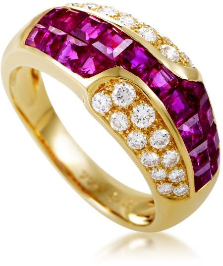 The Mouawad name is synonymous with luxury and opulence, and this ring is a testament to the brand's reputation. Forged from the finest 18K yellow gold, and accented with 2.13ct of invisible-set rubies and .44ct of round diamonds, this ring is clearly fit for a queen!