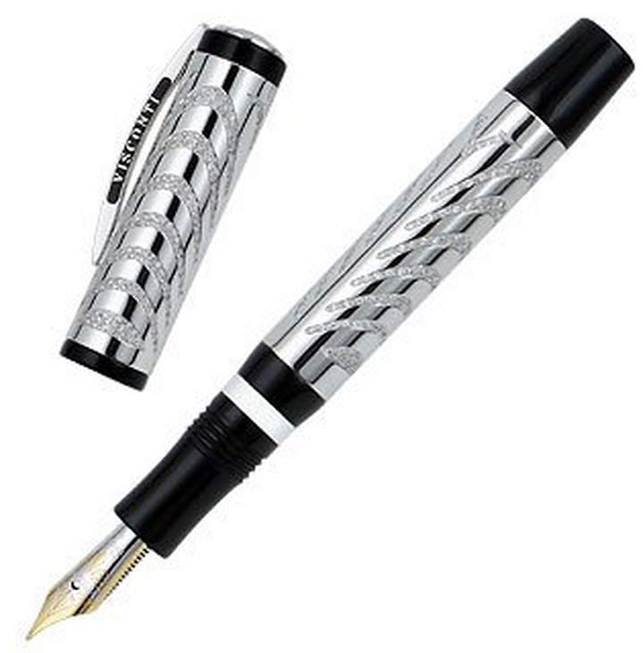 With only 39 pieces produced, Visconti's remarkable Ripple HRH fountain pen features a 23KT palladium dream touch nib and a double reservoir power filler, while its gold resin black shaft sparkles with the 650 white diamonds that adorn it (VS/VVS color GH). The perfect gift for the man who has everything. Signature box included. Made in Italy.